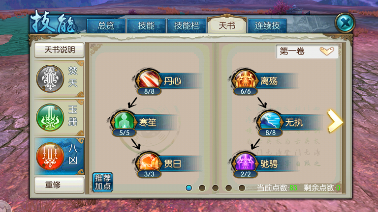 玩好焚香八凶流,关键得把技能和天书搭配明白。八凶主打输出兼辅助,不管是PK还是刷本都很实用。核心思路就是把爆发技能点满,控制技能辅助输出,天书选主八凶副焚天。技能方面优先加满星火、天宗心法、祭剑凝元、醒神决这些基础被动,业火杀和天锁囚怨也得点满,缚足锁魂控制3秒够用,涅槃重生点到5级就成。天书第一卷丹心、离殇、寒笙这些增伤属性优先,第二卷眩灵、冷稍、苦咒提升输出效率,第五卷直接拉满不犹豫。