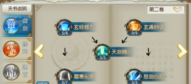 青云天书系统包含御剑、修元、通玄三大分支,每类天书对应不同战斗定位。御剑天书侧重单体爆发与控制,推荐优先点出风剑之芒、内气充盈、破魔怒意等关键节点;修元天书强化生存与续航能力,需注重气贯长虹、雷云奇变等被动加成;通玄天书则平衡输出与控制,神雷御雷真诀相关加成是核心。天书加点需配合技能树规划,例如选择七劫斩龙诀流派需同步强化御剑天书中的暴击相关条目,避免资源分散。