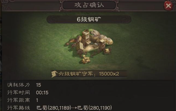 打6级铜矿需要准备至少15000兵力,主力队建议12000左右,清扫队6000和1500各一队。铜矿守军有两队15000兵力的队伍,侦察只能看到第一队的兵种,如果第一队是骑兵,第二队大概率是弓兵,强行针对兵种可能效果不好,建议选择相性高的兵种,比如对面是枪兵就别选弓箭,第二回合容易遇到盾兵导致损失惨重,可以选盾兵这类不克制的兵种。