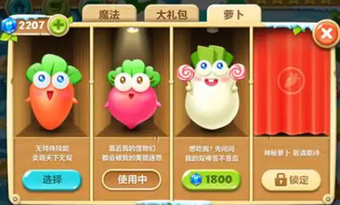说到实用性最强的萝卜,白萝卜绝对值得重点推荐。这家伙不仅基础生命值比普通萝卜多,最棒的是它手上那两根棒棒糖能抵挡两次伤害。也就是说如果怪物只咬了两口,咱们的白萝卜依然能保持完好无损,轻松拿到金萝卜评价。攒够1800宝石解锁它绝对不亏,特别适合那些容易漏怪的关卡。粉红萝卜也很不错,虽然攻击频率低了点,但随机放出的爱心既能打怪又能控场,在怪物密集的时候特别管用。