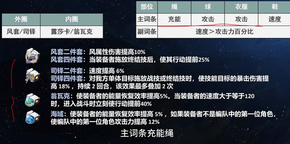 还有个黑科技搭配是骇域漫游的信使四件套,每次开大都给全队提速12%,特别适合需要频繁放大招的阵容。不过要注意队伍里不能有其他角色穿这套,效果会冲突哦!过渡期用生命的翁瓦克二件套也不错,开局直接抢行动条给主C挂buff,还能缓解充能压力。记住千万别头铁全堆输出,适当带点生命防御词条才能站得住场子。