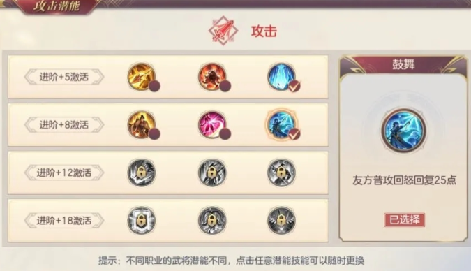 到了+5潜能时,洞察是最优选择,半血后提高免伤效果,让残血的曹仁更难被击杀。攻心不太推荐,因为他的普攻伤害不高,回血效果不明显。+8潜能可以根据阵容来选,如果队伍里有高爆发武将,比如赵云,可以带凯歌增强团队收益;如果是真伤阵容,比如司马懿队,攻袭会更合适。