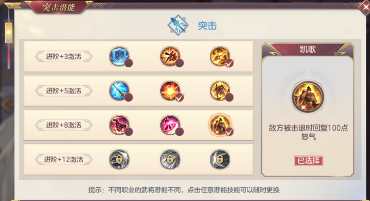 贾诩的毒伤效果是他的招牌能力,因此潜能选择上要尽量放大这一优势。怒焰和蓄势的组合能让他频繁触发中毒,同时通过吸取保持血量健康。无畏则让他在面对高爆发阵容时不至于被秒杀。这套潜能方案不仅适合PVE推图,在PVP中也能发挥不错的效果,尤其是对抗依赖怒气技能的对手时,他的压制力会非常明显。