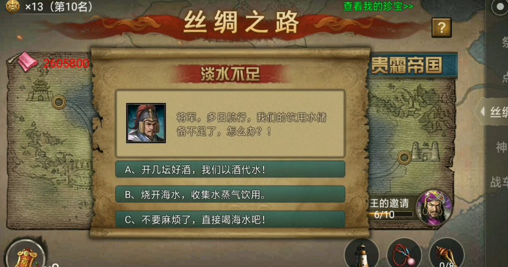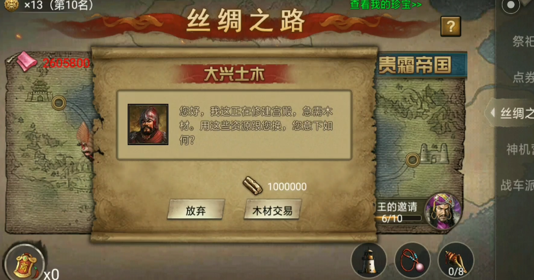 丝绸之路的玩法强调资源管理和风险决策。在通商过程中可能遇到暴雪、流沙、狼群等随机事件,需根据系统提示选择正确应对方式(如全军扎寨,抱团取暖应对暴雪),错误选择可能导致金币损失或探索中断。玩家可通过联盟协作提升贸易安全性,或利用锦囊替代金币支付通行费用,降低资源消耗压力。