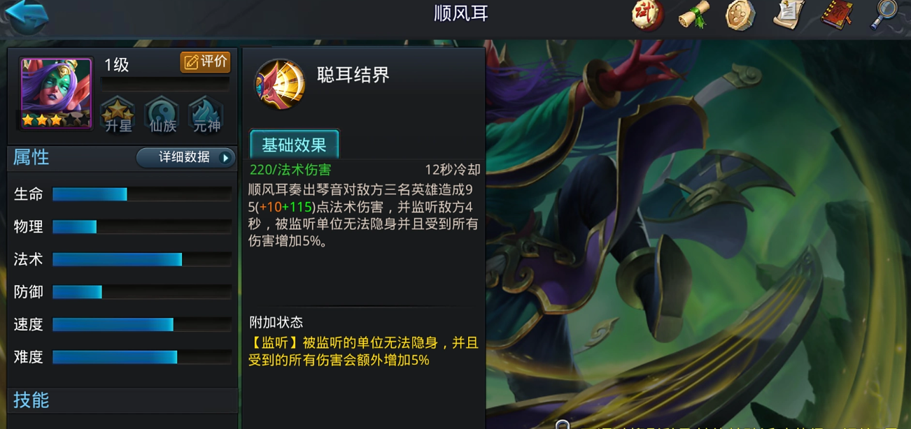 顺风耳作为乱斗西游中的仙族远程法师角色,其核心优势在于强大的监听能力和音波攻击特性,能有效探测隐藏敌人位置并造成范围伤害,适合在团队中担任输出和控制角色。玩家需优先了解其定位:顺风耳感应能力出色,能通过技能如聪耳结界锁定目标,使其无法隐身并暴露视野,同时提升团队对其造成的额外伤害。这种能力在对抗隐身或高机动敌人时尤为关键,有助于扭转战局。在实战中,顺风耳应保持在安全位置输出,避免近身交战,以最大化其远程优势。