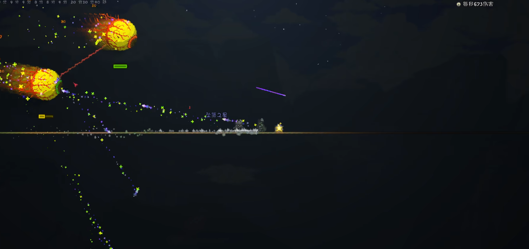 接下来是双子魔眼,这家伙分为两个阶段,第一阶段主要是冲撞,注意保持移动就好。到了第二阶段,其中一只眼睛会喷火,伤害特别高,一定要优先解决它。建议用翅膀或闪电靴在空中绕圈,配合克苏鲁护盾的冲刺效果来躲避攻击。武器可以选择迷你鲨配陨石子弹,或者直接用神圣剑贴脸输出。记得在战斗场地放上篝火和心灯,回血速度会快很多。