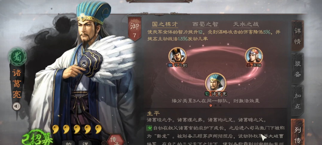 到了赛季中后期,咱们有了更多强将和战法选择,诸葛亮的阵容威力就能完全发挥出来。最经典的莫过于西蜀之智缘分队,诸葛亮搭配徐庶和法正。这个组合激活缘分效果后,全队智力提升还能获得抵御次数,生存能力大增。徐庶能提供可观的谋略输出和负面状态,法正则能持续稳定地给队伍治疗加血,三人同属蜀国还有阵营加成,整体属性非常扎实,攻守平衡,是经久不衰的强力阵容。如果走SP诸葛亮的路线,蜀智队同样适用,SP诸葛亮、庞统、法正组合是主流。SP诸葛亮负责提升庞统那威力巨大但发动看脸的连环计成功率,法正保证队伍续航,三人配合默契,输出上限极高。
