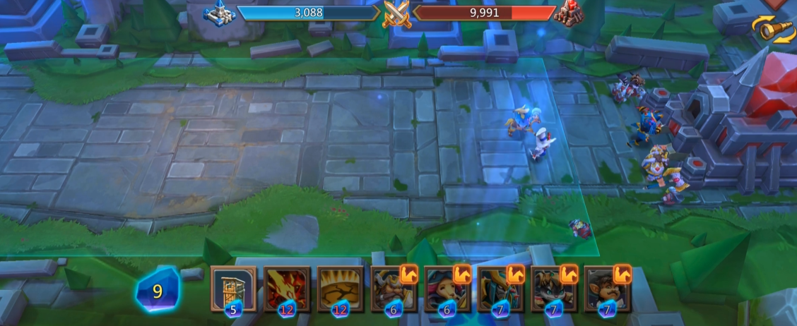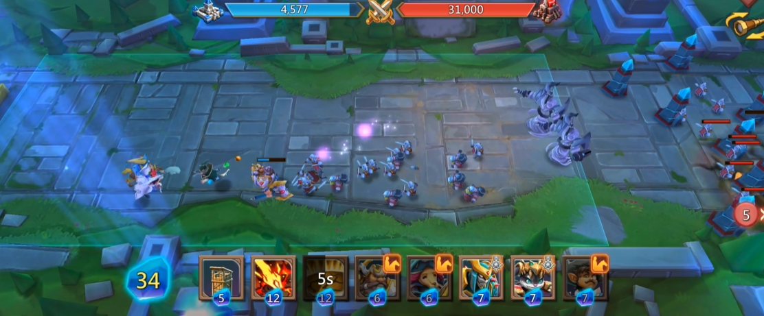 战斗中期需重点保护己方远程单位,避免被敌方英雄突进击杀。大斧头兵阵亡后要迅速补充,同时利用技能清场创造喘息空间。当敌方防御塔被摧毁至一定数量时,可派遣炮车等单位推进战线,但需注意保留部分资源应对突发状况。清除所有入侵敌人后,集中火力攻击敌方水晶即可完成关卡。