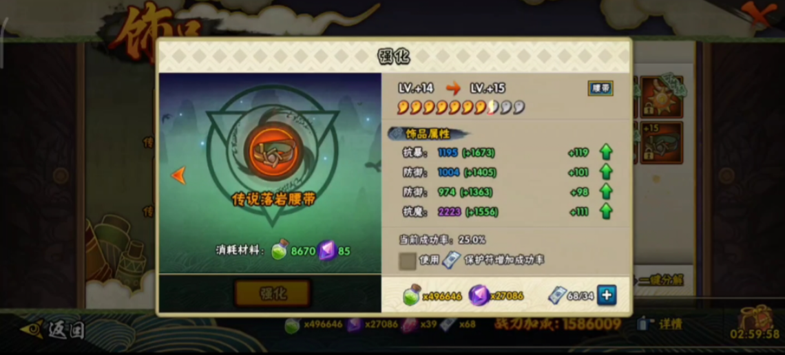 强化材料主要靠分解多余饰品和组织挖矿获得,秘境宝箱也能开出一些。强化时前5次100%成功,从第6级开始概率会下降,这时候可以考虑用保护符保底。洗练属性时优先选暴击和攻击加成,这两条对战力提升最明显。如果暂时刷不到橙色饰品,紫色强化到+15也能通过继续强化变成橙色,只是消耗会大一些。