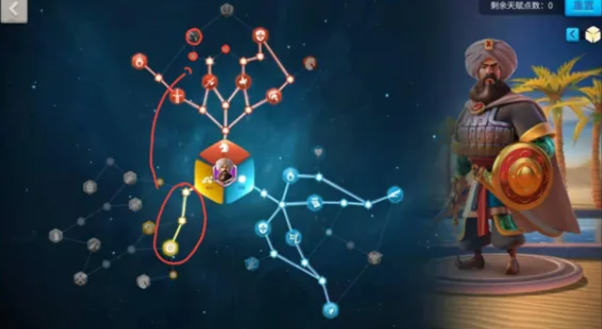 天赋配置需优先点满骑兵系风驰电掣与技能系蓄力爆发,强化行军速度与技能伤害。骑兵天赋的机动性加成可弥补拜巴尔身板脆弱的缺陷,而技能天赋的怒气恢复和伤害提升能保证风沙暴高频释放。攻城系天赋收益较低,不建议分配。装备选择以攻击属性为主,如索尔的复仇套装,副属性优先骑兵攻击与行军速度。