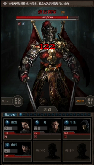 开局后坦克角色应立即使用嘲讽技能吸引仇恨,治疗角色需要全程保持坦克的血线安全。输出职业应在嘲讽生效后的三回合内集中火力,辅助角色则负责及时清除负面状态并提供增益效果。当将军血量降至50%以下时会进入狂暴状态,更需严格控制队伍站位,避免被范围技能同时命中多个成员。