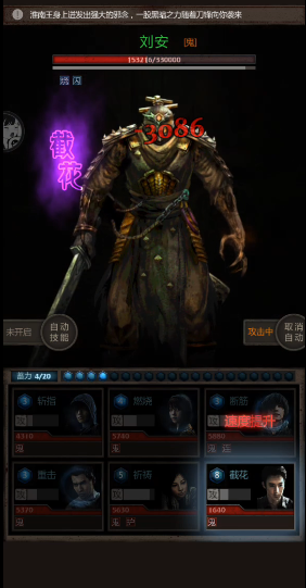 开场直接让胖子开启嘲讽,把刘安的仇恨牢牢拉住。这时候要注意观察血量,奶妈要及时给胖子回血,推荐用薇莉杨或彩儿这类群体治疗角色。刘安有个很恶心的折斩技能专打血量最低的角色,所以一定要保证胖子的血量健康,避免连锁反应导致团灭。如果队伍里有瞎子这类能贴符的角色,可以配合胖子的嘲讽打出反弹伤害效果。