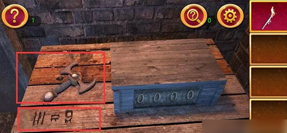 咱们仔细搜索房间的关键道具。点击中间的桌子,你会找到一个剑柄,同时留意到桌面上有个提示:Ⅲ=9,这意味着密码的第三位是9。用火把照亮左边墙壁上的小洞,伸手进去就能拿到一把钥匙。用这把钥匙打开左边的箱子,取出里面的剑刃,箱子里还藏着另一个提示:Ⅱ=5,指密码的第二位是5。每个道具都要收好,别漏掉角落。