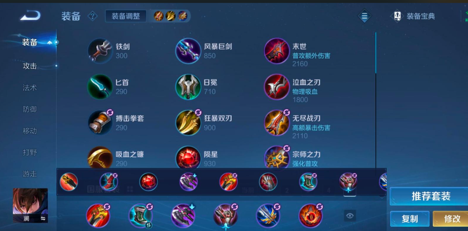在装备选择上,优先以冷却缩减和法术攻击为主,推荐出装顺序为贪婪之噬、抵抗之靴、暗影战斧、宗师之力、破军和末世;贪婪之噬提升清野效率,抵抗之靴减少控制时间并增加移速,暗影战斧提供物理穿透和冷却缩减,宗师之力强化技能后普攻伤害,破军增强收割能力,而末世则针对坦克目标,这套组合确保澜在团战中快速释放技能并保持高输出节奏。