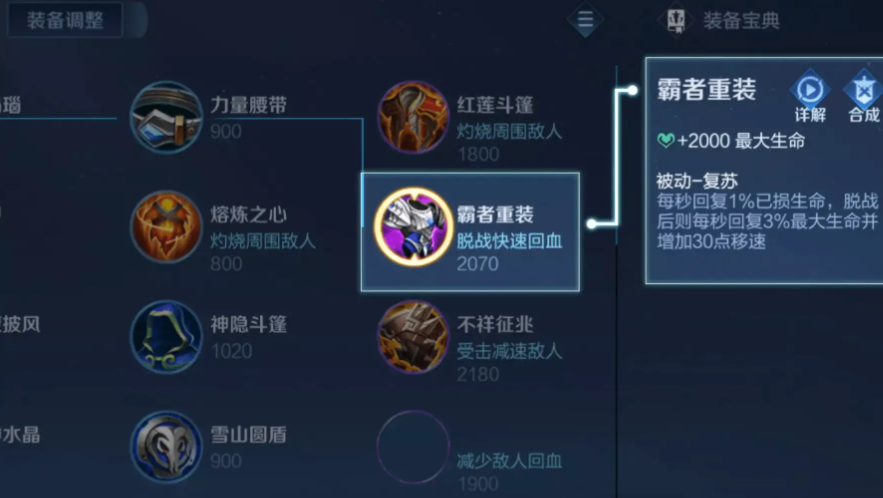 霸者重装能提供可观的生命值和脱战回复,极大提升你的续航和承伤能力,让你在拉扯战中更持久。如果对面治疗能力强,梦魇之牙的重伤效果必不可少,它能有效抑制敌人回复。贤者之书和博学者之怒这类高法强装备,虽然能显著提升护盾厚度和治疗量,但前提是你在团战中能站得住。如果生存压力大,优先考虑不祥征兆或魔女斗篷这些防装会更稳妥。后期格子紧张,主动辅助装通常只出一件。