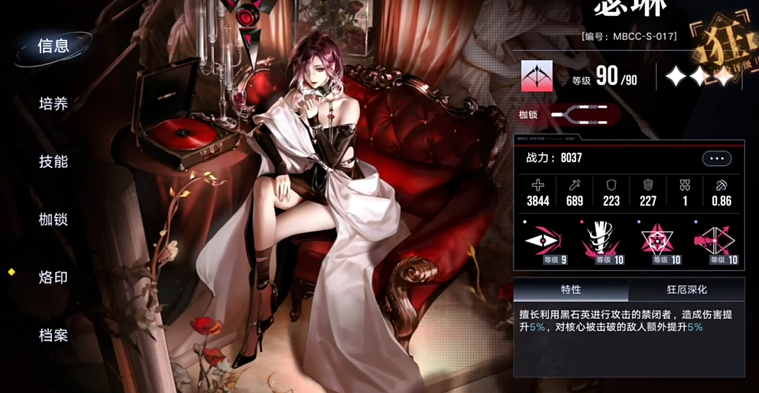 瑟琳是当前版本综合实力顶级的法系输出角色。瑟琳的定位是具备破核能力的法系射手,其技能组集大范围AOE、高额伤害和破核能力于一身,被认为是法系输出中的T0级别主C,有能力稳压其他法伤输出角色,投入资源培养绝对不会亏。