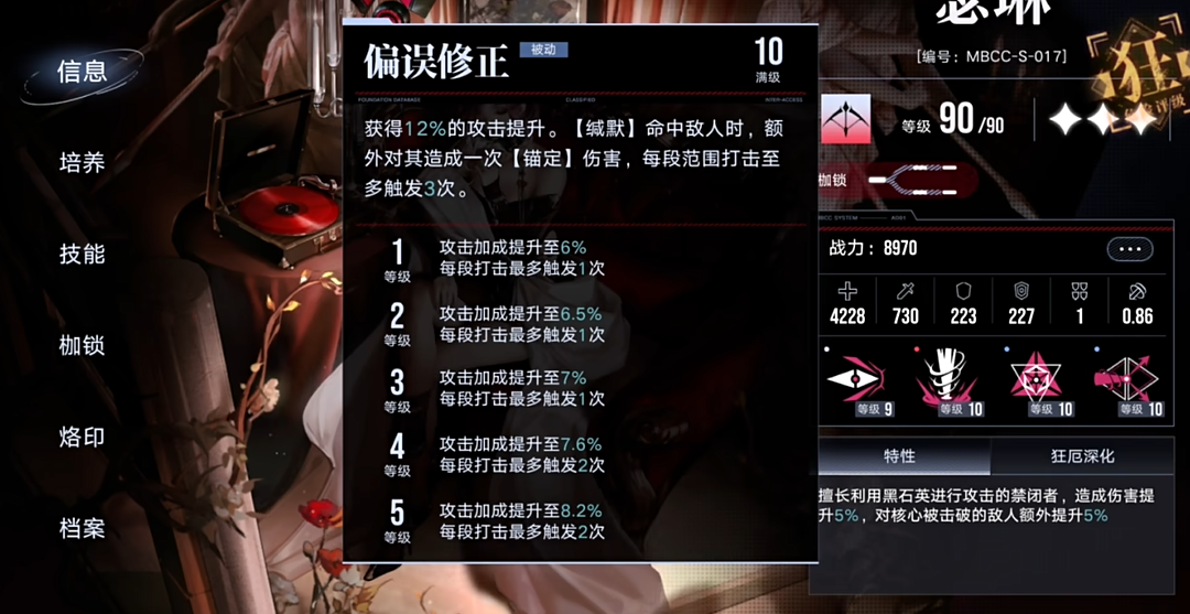 瑟琳的专烙和技能加点有明确的优化路径。她的专属烙印监视者可以制造一个不会被摧毁的棱镜,这个棱镜能作为黑曜折射的弹射目标,这极大地提升了她对单体敌人时的伤害输出能力,因此开启专烙的优先级非常高。技能加点方面,普遍的推荐是先将技能等级提升至0008,即优先将第四个被动技能升到8级产生质变,这个技能能让她大招的每段伤害都额外触发多次普攻追击。具体的升级顺序则根据场景调整,例如清剿杂兵推荐按1、3、2、4技能的顺序升级,而在破碎防线中作为主力输出则推荐按2、1、3、4的顺序。