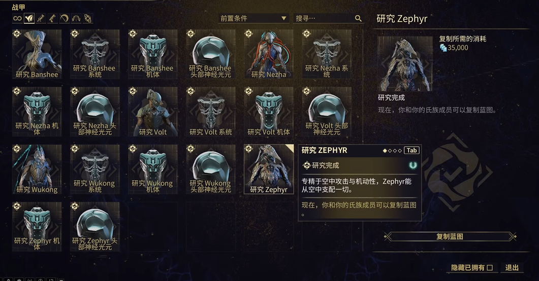 获得zephyr战甲的核心途径是通过解锁并加入一个拥有完善研究设施的氏族,在其道场的能源实验室中完成该战甲的专项研究后,购买并制作所有部件与总图。这条路径要求你首先找到一个活跃的氏族并加入,因为zephyr的所有部件蓝图都无法在常规任务或商城中直接获取,必须依赖氏族集体研究的成果。进入氏族道场后,你需要找到能源实验室,在其中启动对zephyr战甲的头部神经光元、机体和系统三个部件的研发项目。