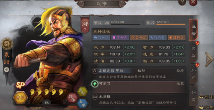 SP袁绍作为群雄势力在S5赛季的重要补充,其自身战法具有持续的谋略输出和高概率的缴械控制能力,对依赖普通攻击的物理队伍形成天然克制。由于其稳定的输出机制和强大的功能性,SP袁绍在多种阵容搭配中都有出色表现,尤其是在中后期的持久战中能持续提供压制力,是构建群弓等平民友好阵容的优质选择。