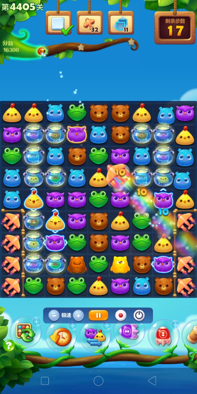 进入关卡后,切勿跟随系统提示操作,第一步直接瞄准气鼓鱼消除,触发连续爆炸效果,以此节省初始步数。紧接着快速清理场上银币,激活底部与水母上方的魔法石,魔法石激活后可带动周边消除,还能高效产出钥匙。收集钥匙时要果断,拿到钥匙后立即将消除重心转移至右侧魔法石区域,右侧是小黄鸡产出的核心地带,持续消除能稳定孵化小黄鸡,避免在金属栅栏附近激发小鸡,防止无谓消耗步数。消除过程中优先制造直线与爆炸特效,四个同色动物连成一线生成直线特效,可快速清理横向或纵向障碍,五个同色动物组成L型或T型形成爆炸特效,能炸开密集区域,为魔法石激活与连消创造空间。