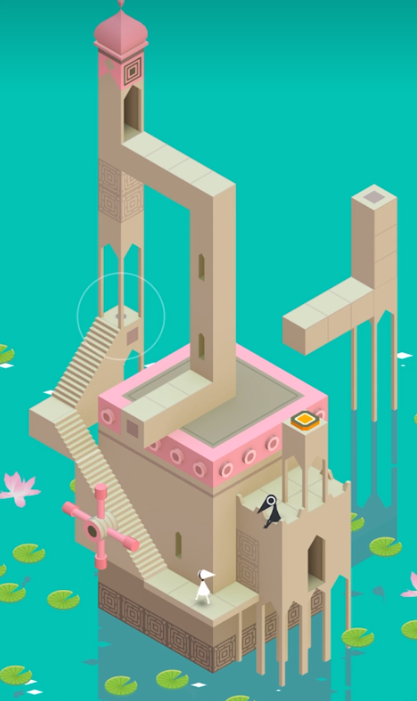 该场景同样没有主角,需要通过滑动机关引导乌鸦人完成操作。进入空间后,滑动场景右侧的长条状机关,调整机关高度为乌鸦人搭建通行路径,让乌鸦人顺利移动至开关处并踩下,成功点亮第四座灯塔。当四座灯塔全部点亮后,箱子左侧会出现一个总开关,点击开启总开关,再滑动箱子右侧的滑块,会解锁新的机关与场景,主角艾达会重新出现在场景中。此时依次操控艾达踩下场景内依次出现的按钮,每踩下一个按钮就会解锁新的路径与楼梯,逐步延伸通往终点的道路,过程中会出现可转动的齿轮机关,转动齿轮能开启隐藏的墙体与通道,进一步拓展可移动的区域。