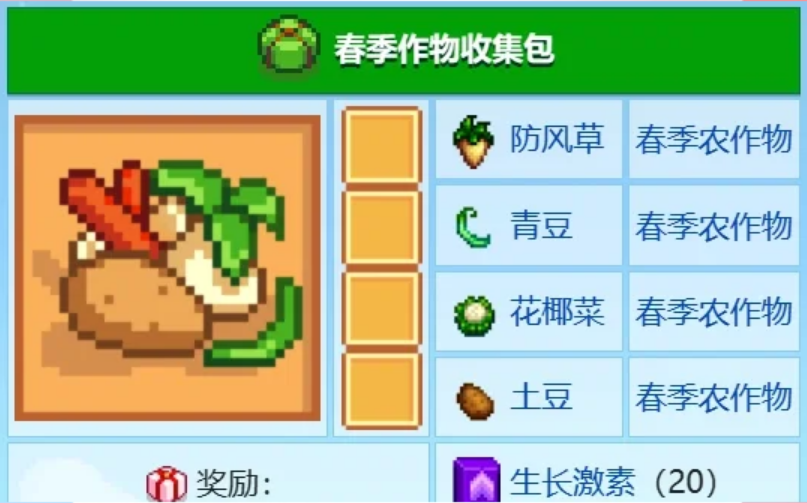 春季觅食收集包需要野山葵、黄水仙、韭葱和蒲公英;夏季需要香味浆果、葡萄和甜豌;秋季需要常见的蘑菇、野李子和枫糖浆;冬季则需要冬日硕根、水晶果和冬山药等物品。建筑收集包要求提交99个木材、99个石材和10个硬木,这些材料主要通过砍伐树木和采矿获得。异域情调觅食收集包则需要提交椰子、仙人掌果子、山洞萝卜等特殊物品。