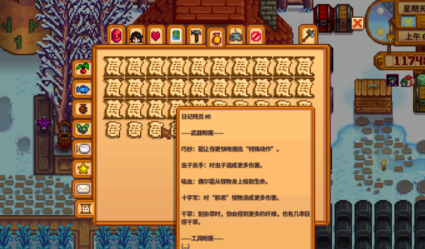 日记残页是星露谷物语中一种特殊的收集品,共有11页,由所留。这些残页主要通过挖掘、开箱子以及完成特殊任务获取,分布在社区中心、城堡、礁石、矿道等地点。收集后能帮助玩家了解星露谷的历史背景和隐藏秘密,对探索宝藏有重要指引作用。