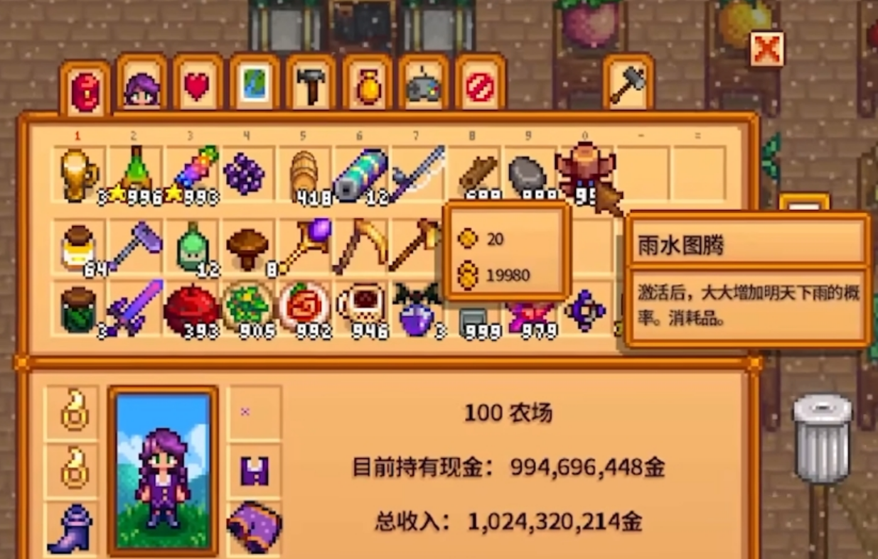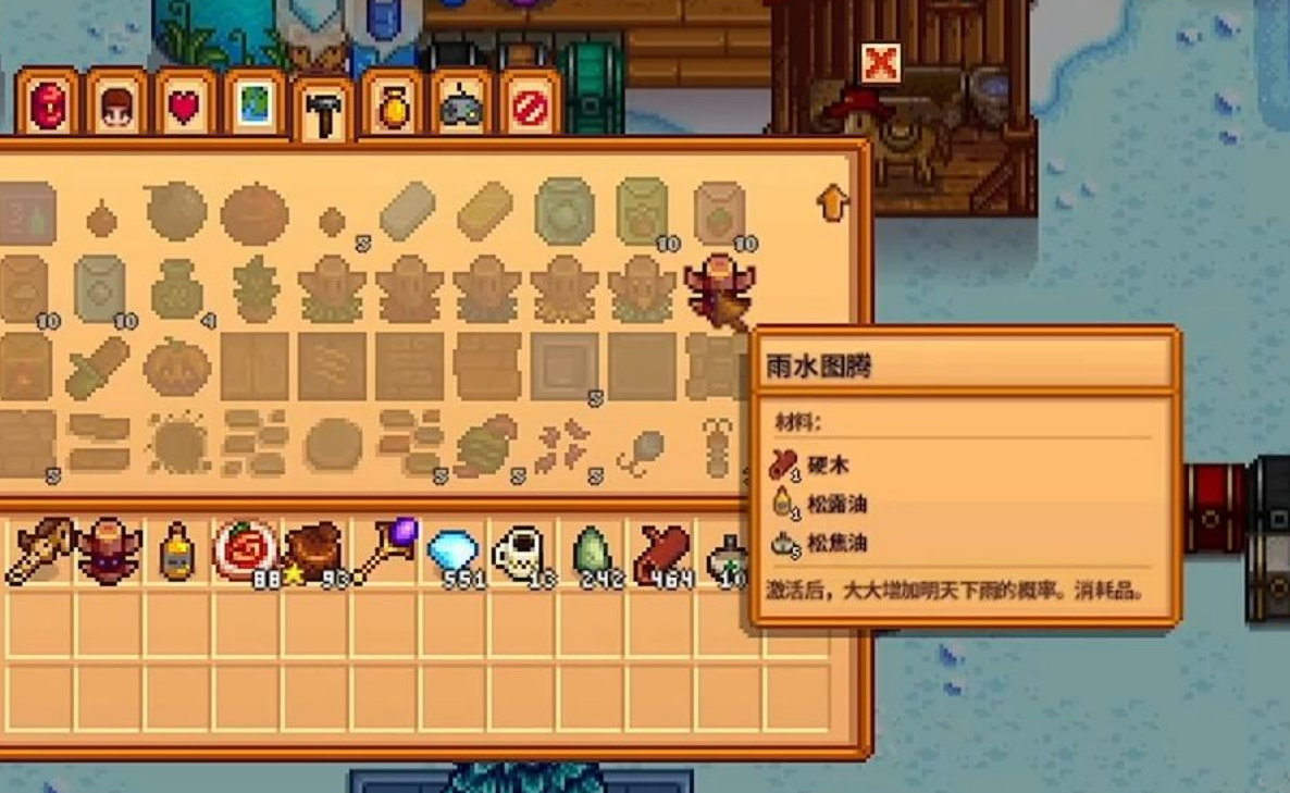 材料凑齐后,打开制作栏找到祈雨图腾,点击制作就行。使用祈雨图腾的方法很简单,把它拿在手里右键点击任意位置,第二天就会下雨。祈雨图腾是一次性的,用一次就没了,所以最好在需要的时候再制作。节日的前一天或者季节的最后一天使用祈雨图腾是没效果的,别浪费材料。