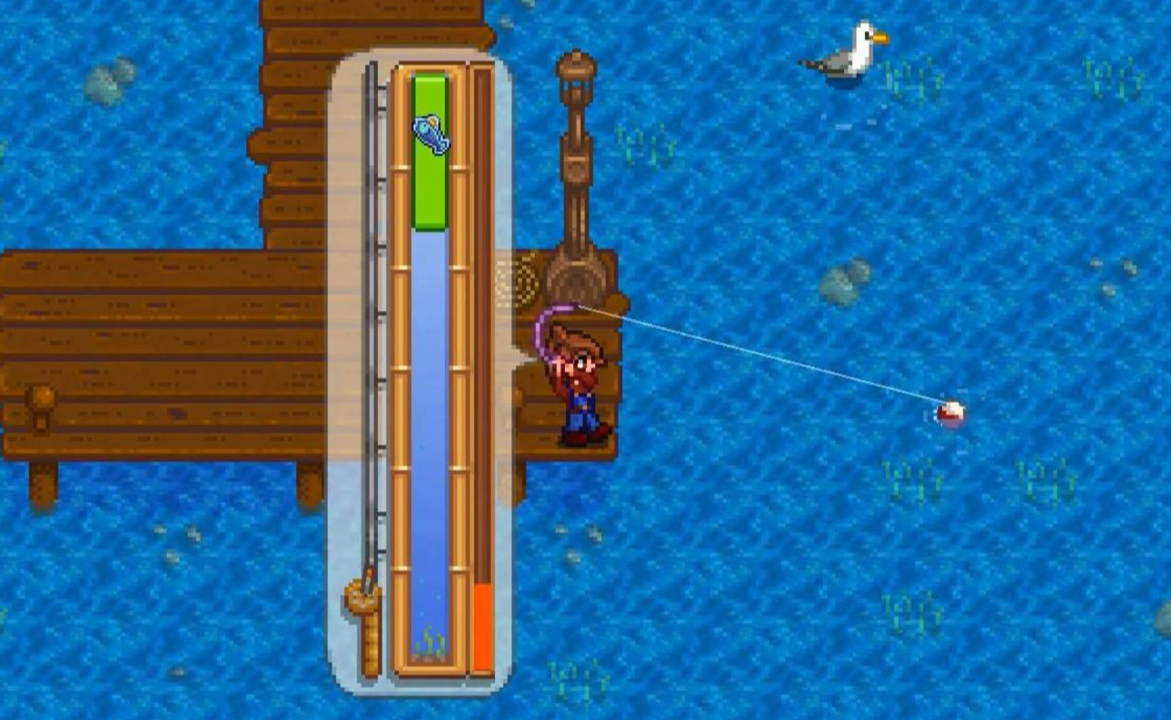 抛竿时按住鼠标左键会显示力度条,力度越大抛得越远,深水区更容易钓到高品质鱼。鱼上钩后会出现小游戏界面,通过控制绿色进度条覆盖鱼的位置来完成捕捉。钓具的效果会直接影响小游戏的难度,比如软木塞浮标能稍微扩大绿色条的范围,让操作更轻松。如果觉得钓鱼太难,可以先提升钓鱼等级或食用增加钓鱼技能的食物,临时提高操作容错率。